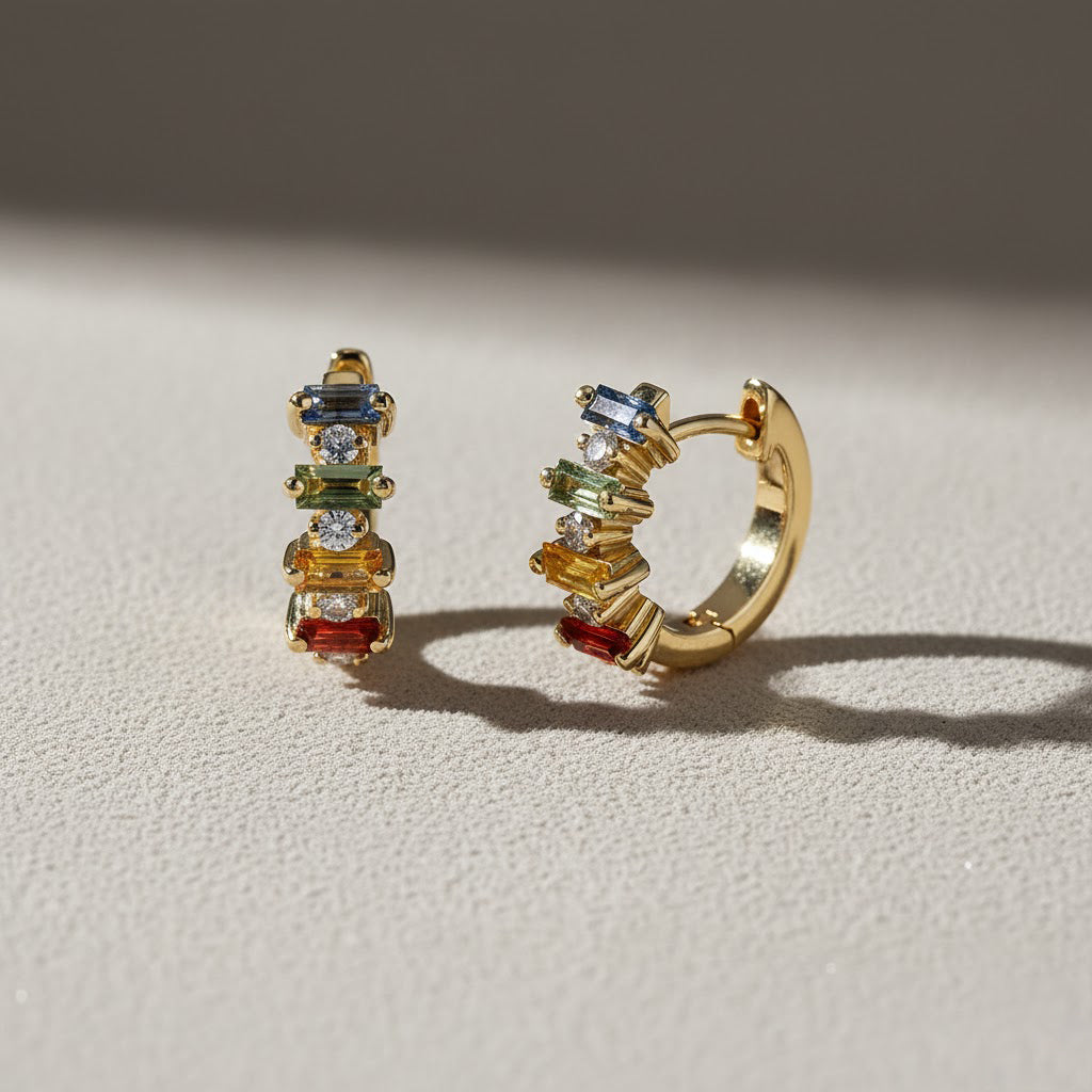 14 Ayar Altın Pırlanta Taşlı Karışım Safir Çivili Halka Küpe