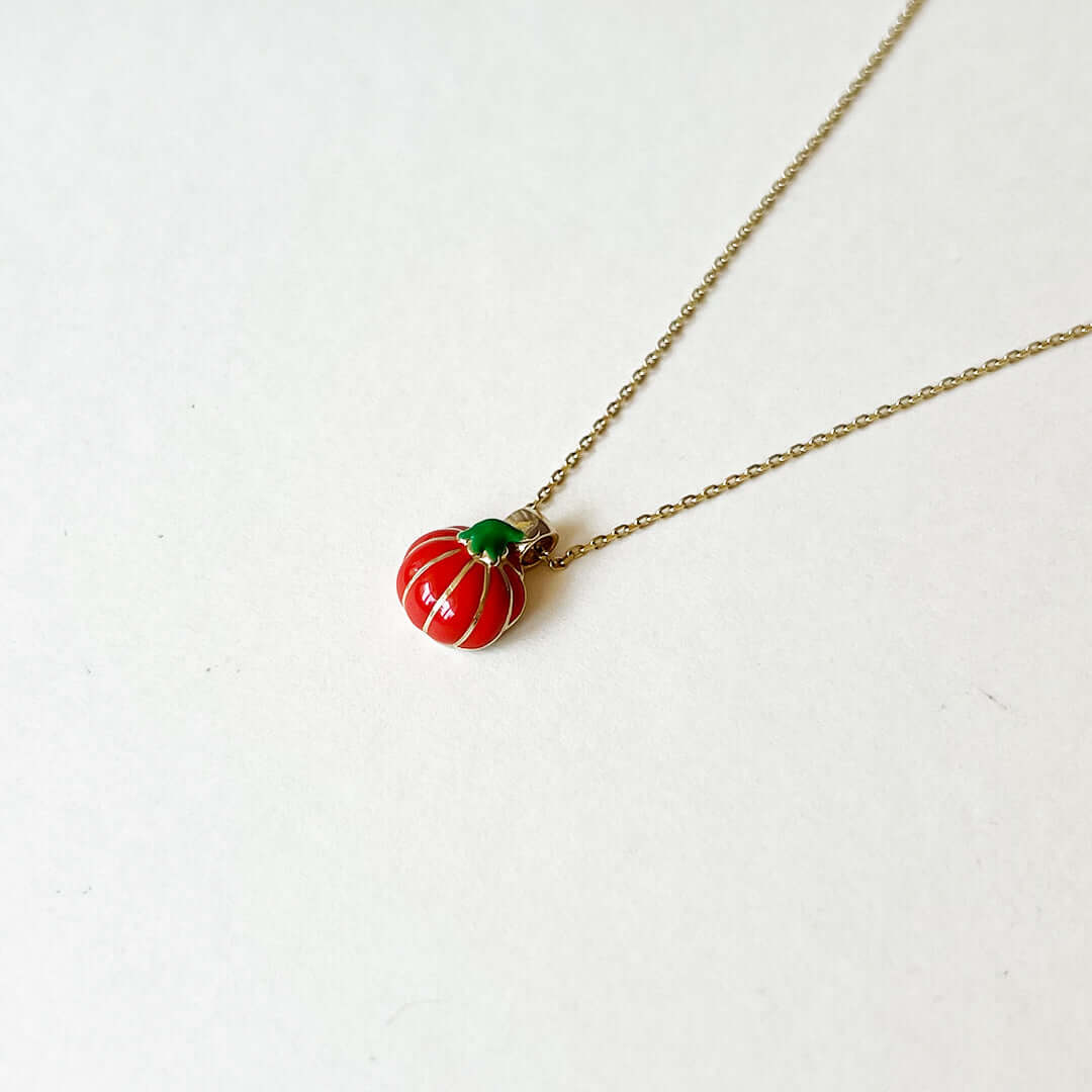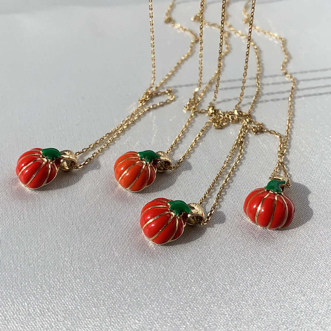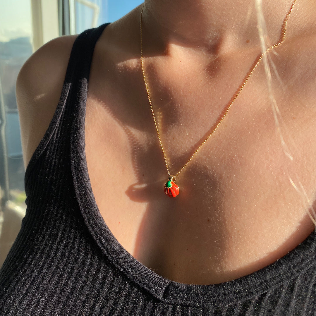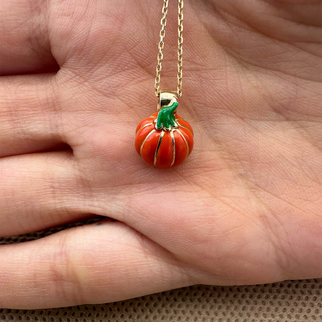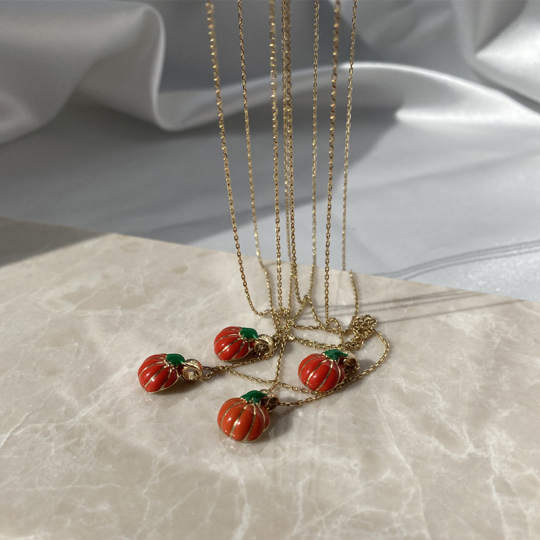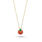 14 Ayar Altın 3D Turuncu ve Yeşil Mineli Balkabağı Cadılar Bayramı Kolye
