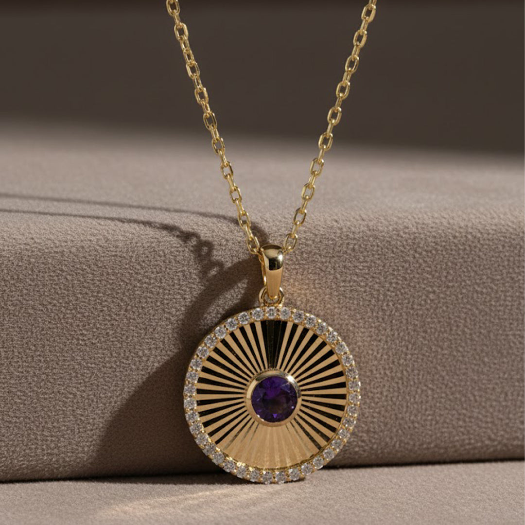 14 Ayar Altın Disc Ray Ametist Taşlı Pırlanta Madalyon Kolye