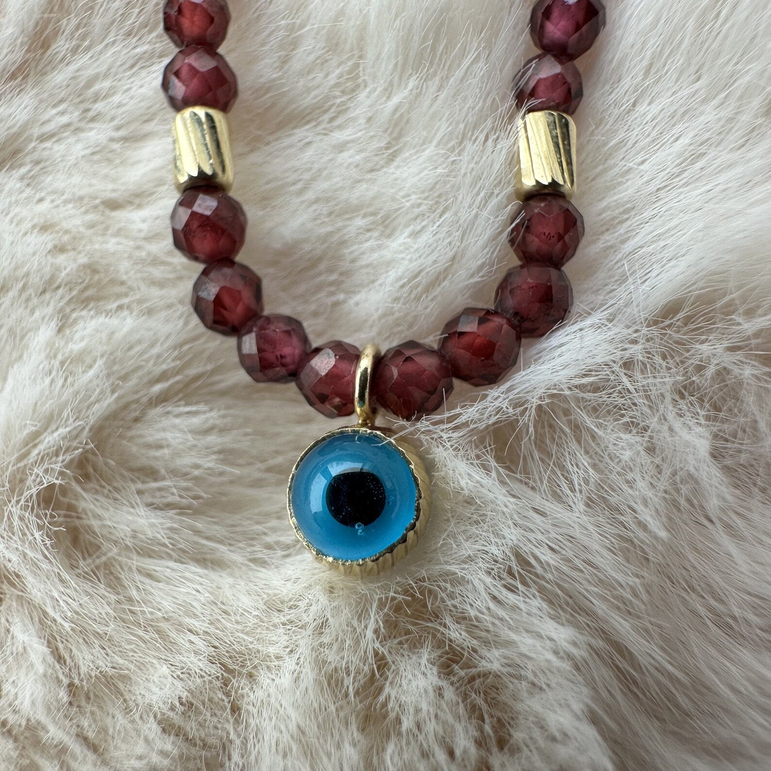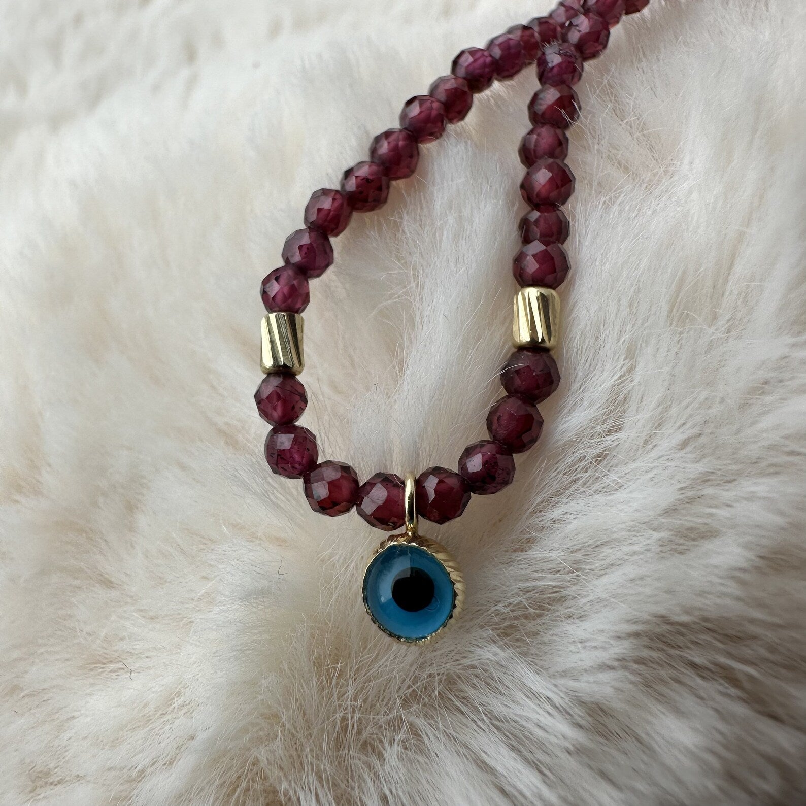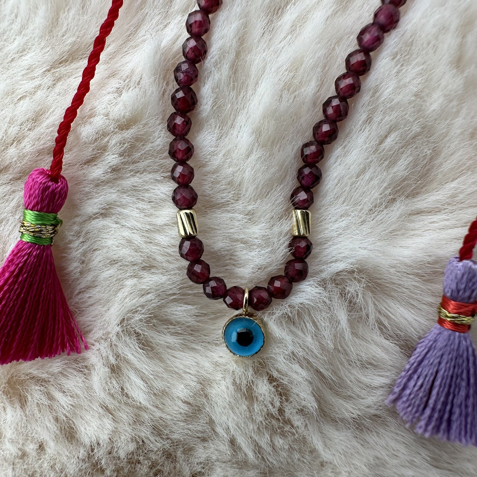 14 Ayar Altın Garnet Taşlı Nazar Püsküllü Kolye