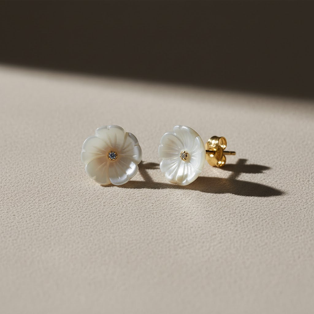 14 Ayar Altın Jasmine Pırlanta Beyaz Sedef Küpe