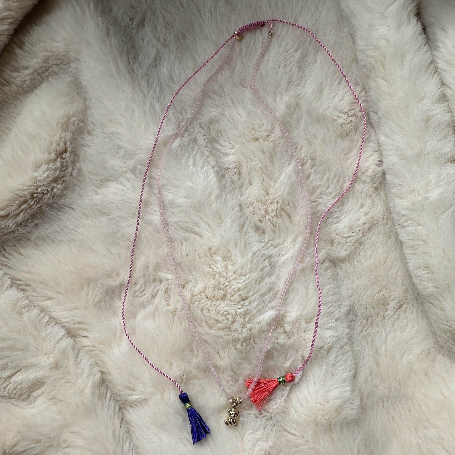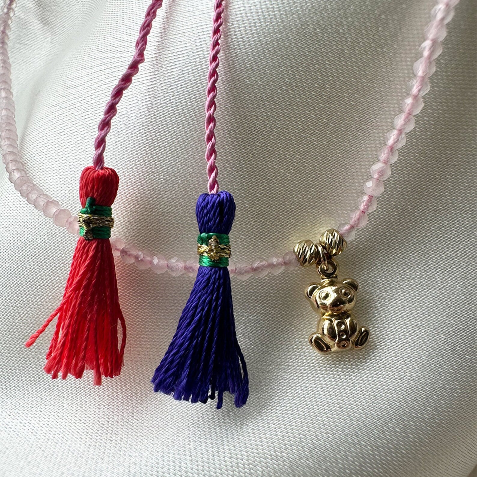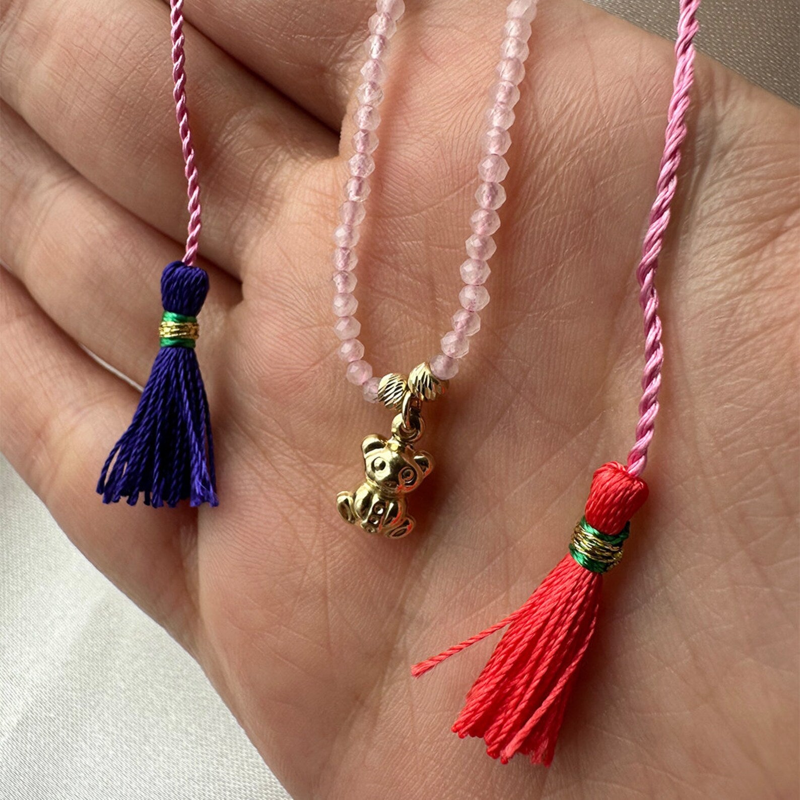 14 Ayar Altın Pembe Kuars Taşlı Ayıcık Püsküllü Kolye